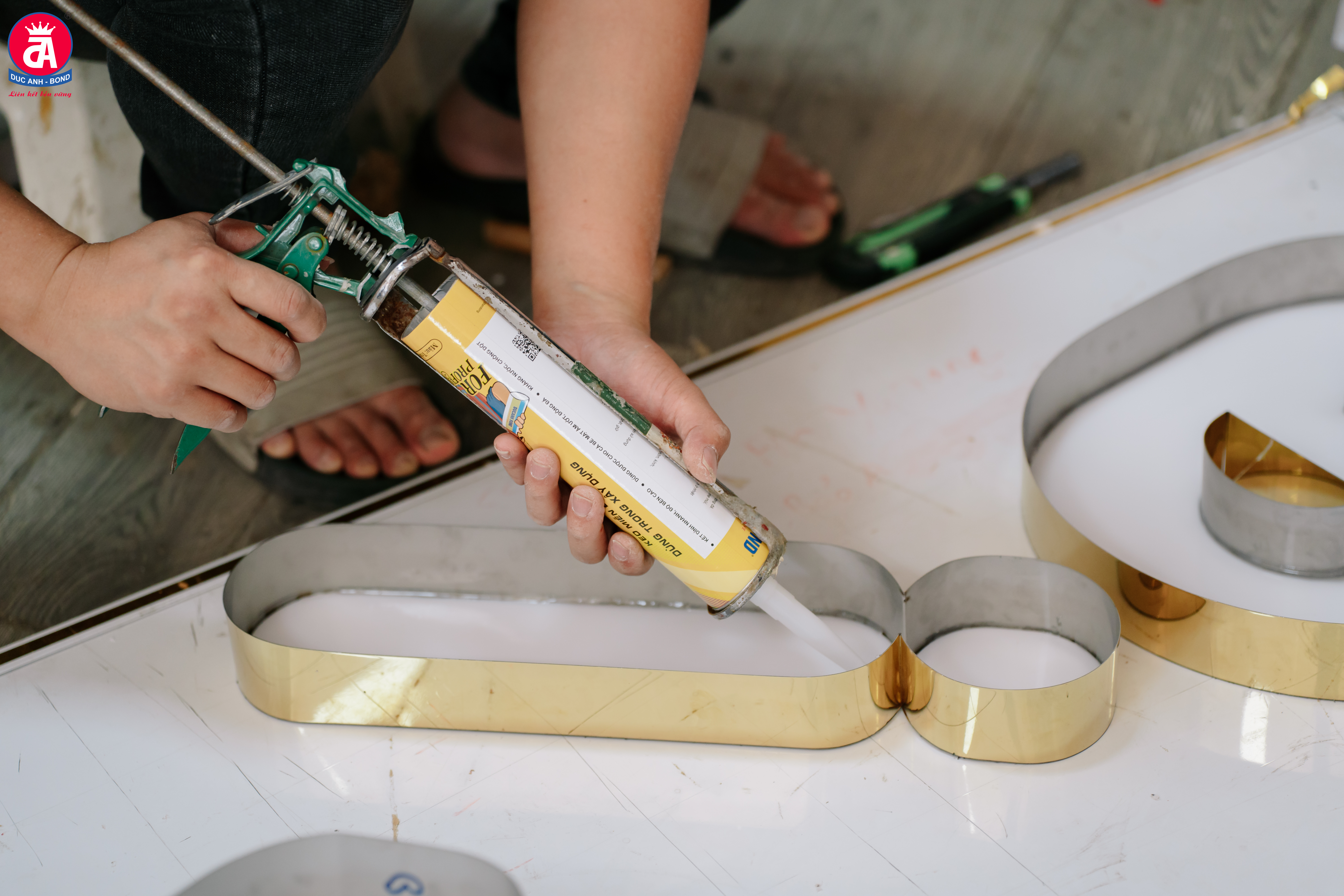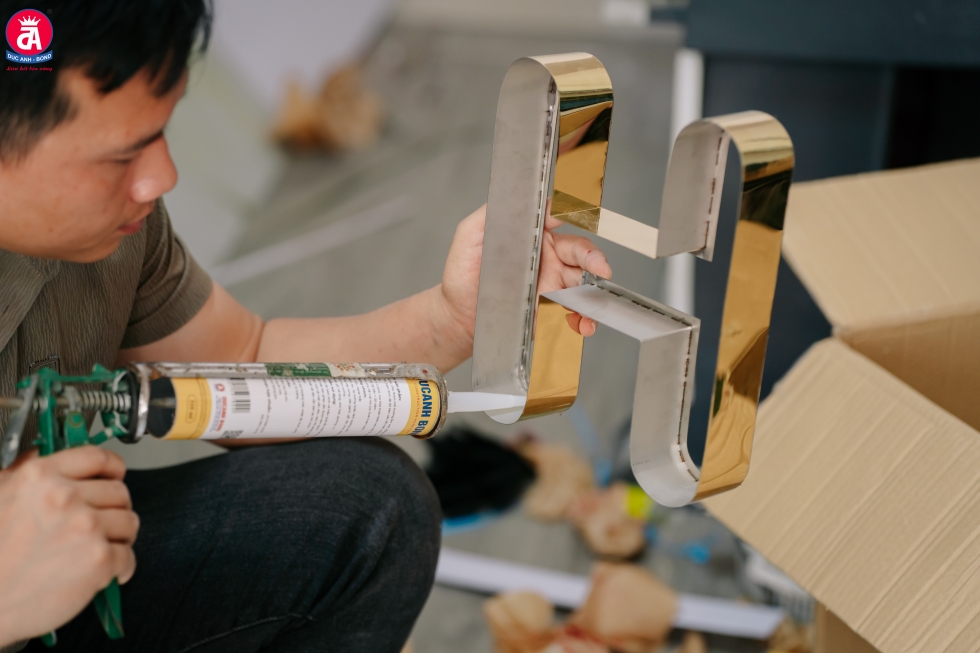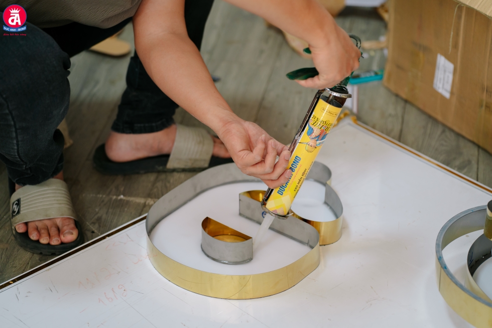 Thợ thi công dùng keo Miễn Đinh Đức Anh để gắn chữ nổi lên bề mặt Alu, quá trình đảm bảo liên kết chắc chắn, không để lộ mối nối